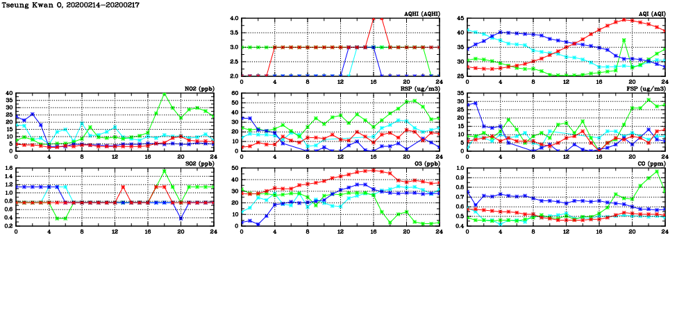 | Air Quality Data Time Series in Tseung Kwan O (2020/02/17) | ( Line colors: Day -3 Day -2 Day -1 Current day ) | 2D Map Current AQHI |