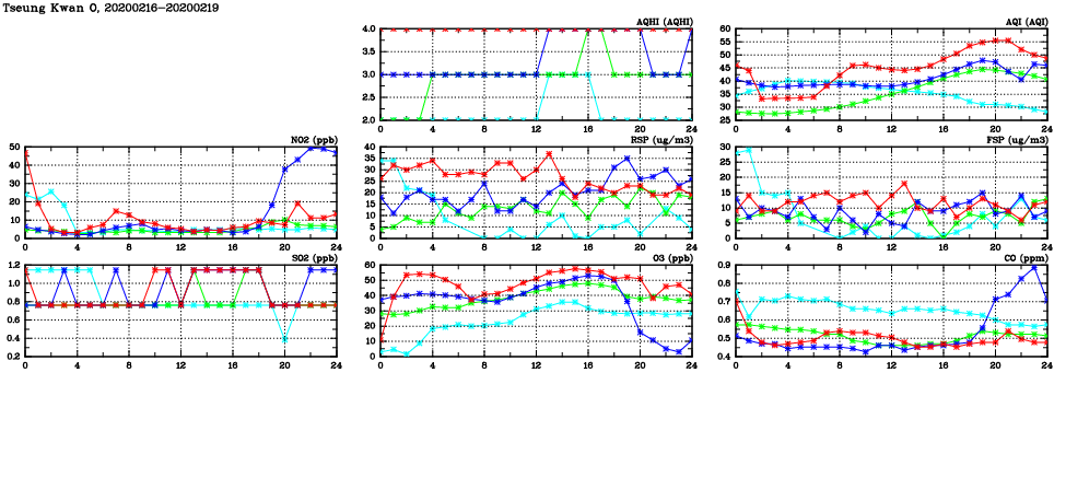 | Air Quality Data Time Series in Tseung Kwan O (2020/02/19) | ( Line colors: Day -3 Day -2 Day -1 Current day ) | 2D Map Current AQHI |