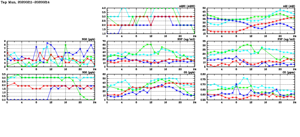 | Air Quality Data Time Series in Tap Mun (2020/02/14) | ( Line colors: Day -3 Day -2 Day -1 Current day ) | 2D Map Current AQHI |