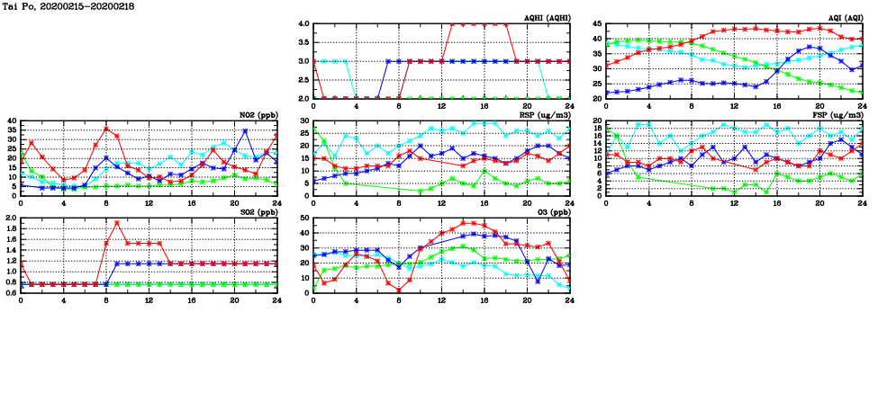 | Air Quality Data Time Series in Tai Po (2020/02/18) | ( Line colors: Day -3 Day -2 Day -1 Current day ) | 2D Map Current AQHI |