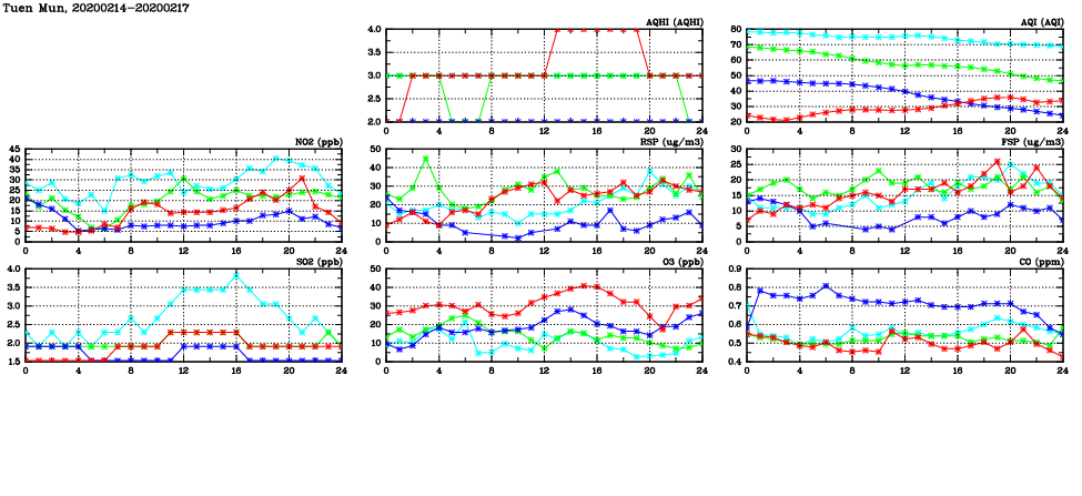 | Air Quality Data Time Series in Tuen Mun (2020/02/17) | ( Line colors: Day -3 Day -2 Day -1 Current day ) | 2D Map Current AQHI |