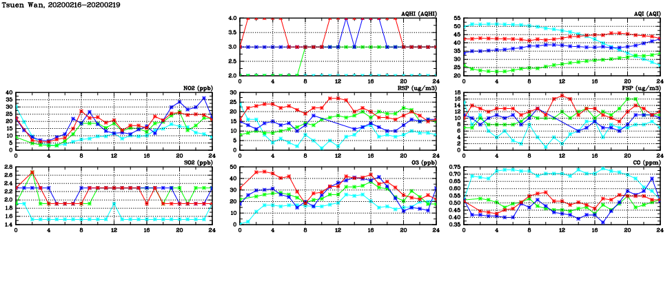 | Air Quality Data Time Series in Tsuen Wan (2020/02/19) | ( Line colors: Day -3 Day -2 Day -1 Current day ) | 2D Map Current AQHI |