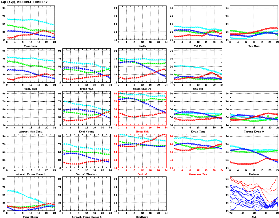 | Air Quality Data Time Series for AQI (2020/02/17) | ( Line colors: Day -3 Day -2 Day -1 Current day ) | 2D Map Current AQHI |
