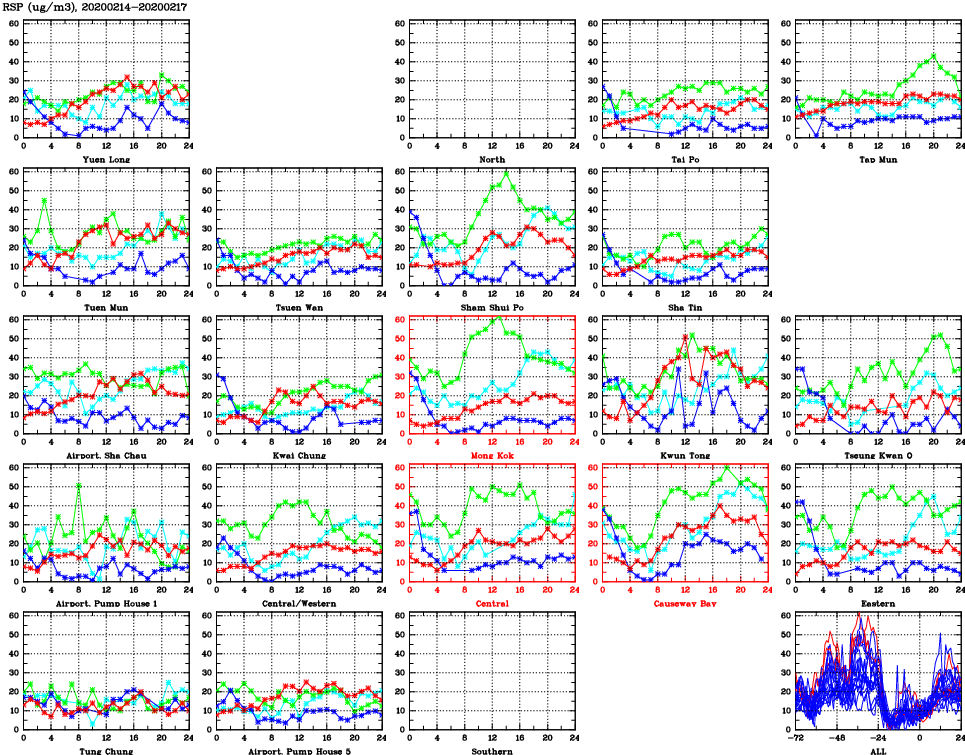 | Air Quality Data Time Series for RSP (2020/02/17) | ( Line colors: Day -3 Day -2 Day -1 Current day ) | 2D Map Current AQHI |