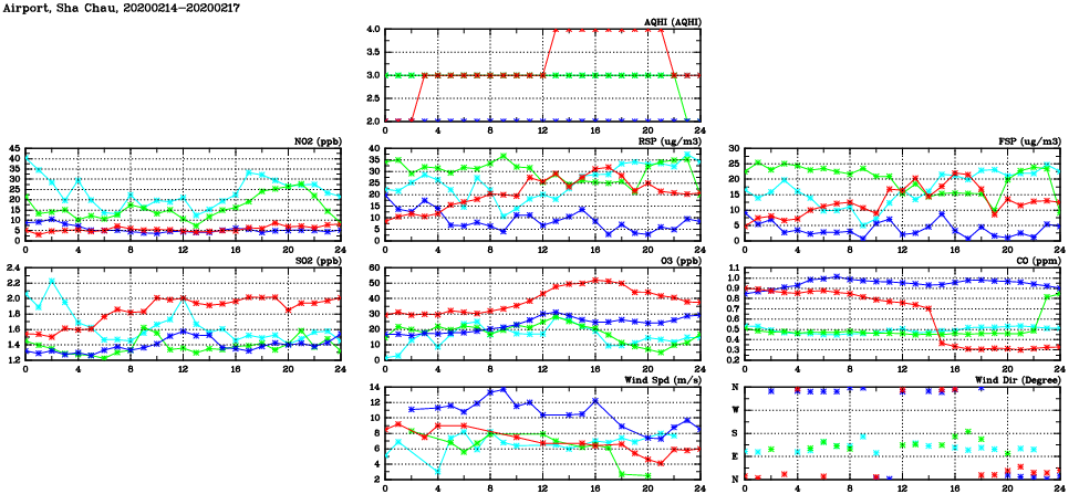 | Air Quality Data Time Series in Airport, Sha Chau (2020/02/17) | ( Line colors: Day -3 Day -2 Day -1 Current day ) | 2D Map Current AQHI |