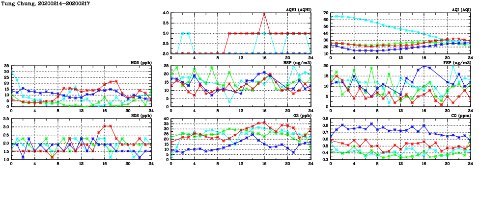 | Air Quality Data Time Series in Tung Chung (2020/02/17) | ( Line colors: Day -3 Day -2 Day -1 Current day ) | 2D Map Current AQHI |