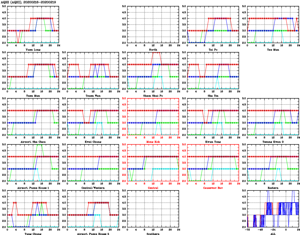 | Air Quality Data Time Series for AQHI (2020/02/19) | ( Line colors: Day -3 Day -2 Day -1 Current day ) | 2D Map Current AQHI |