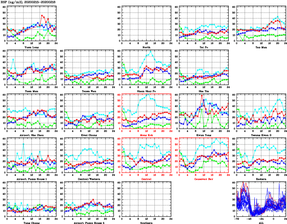 | Air Quality Data Time Series for RSP (2020/02/18) | ( Line colors: Day -3 Day -2 Day -1 Current day ) | 2D Map Current AQHI |