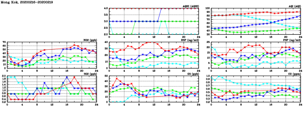 | Air Quality Data Time Series in Mong Kok (2020/02/19) | ( Line colors: Day -3 Day -2 Day -1 Current day ) | 2D Map Current AQHI |