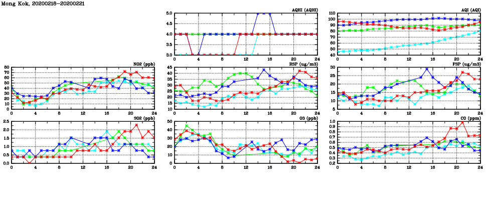 | Air Quality Data Time Series in Mong Kok (2020/02/21) | ( Line colors: Day -3 Day -2 Day -1 Current day ) | 2D Map Current AQHI |