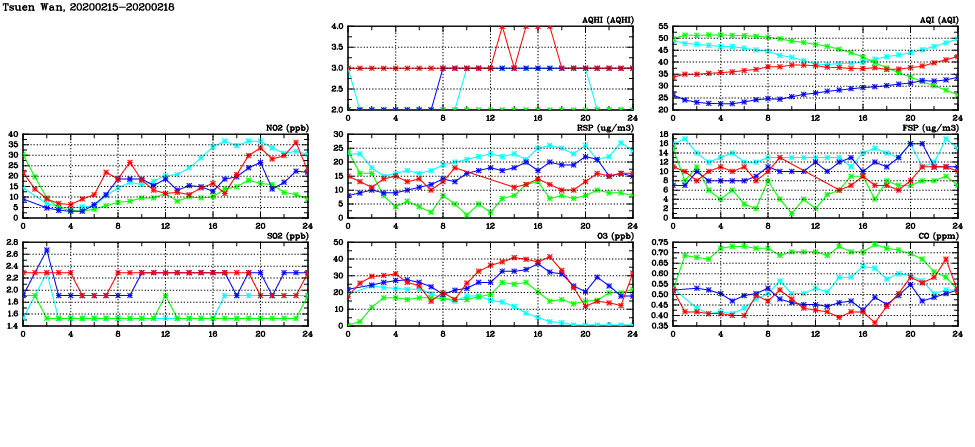 | Air Quality Data Time Series in Tsuen Wan (2020/02/18) | ( Line colors: Day -3 Day -2 Day -1 Current day ) | 2D Map Current AQHI |