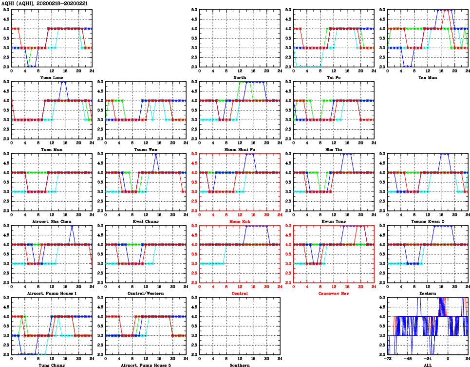 | Air Quality Data Time Series for AQHI (2020/02/21) | ( Line colors: Day -3 Day -2 Day -1 Current day ) | 2D Map Current AQHI |