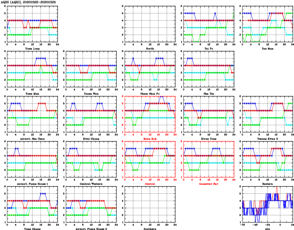 | Air Quality Data Time Series for AQHI (2020/03/25) | ( Line colors: Day -3 Day -2 Day -1 Current day ) | 2D Map Current AQHI |