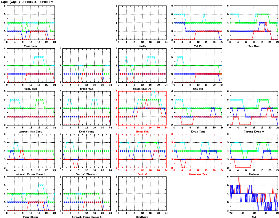 | Air Quality Data Time Series for AQHI (2020/03/27) | ( Line colors: Day -3 Day -2 Day -1 Current day ) | 2D Map Current AQHI |