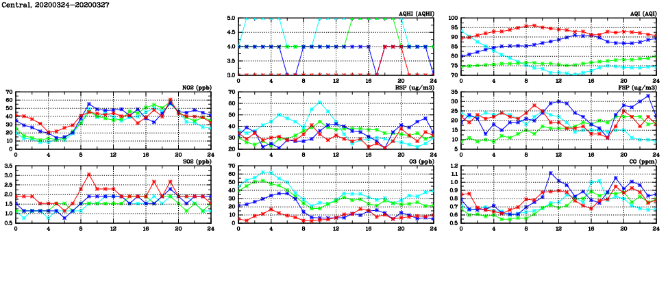 | Air Quality Data Time Series in Central (2020/03/27) | ( Line colors: Day -3 Day -2 Day -1 Current day ) | 2D Map Current AQHI |