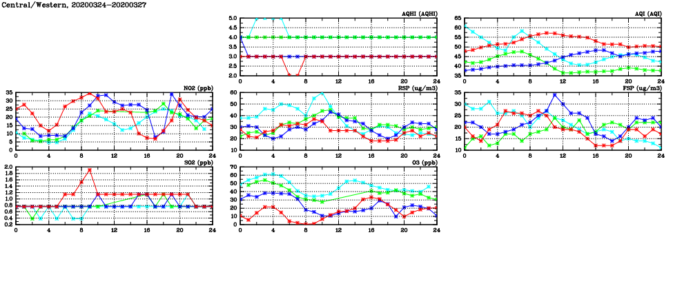 | Air Quality Data Time Series in Central/Western (2020/03/27) | ( Line colors: Day -3 Day -2 Day -1 Current day ) | 2D Map Current AQHI |