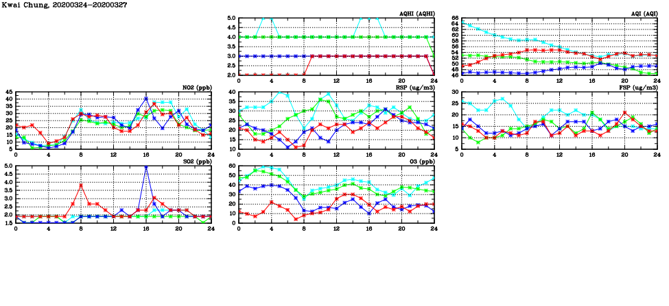 | Air Quality Data Time Series in Kwai Chung (2020/03/27) | ( Line colors: Day -3 Day -2 Day -1 Current day ) | 2D Map Current AQHI |