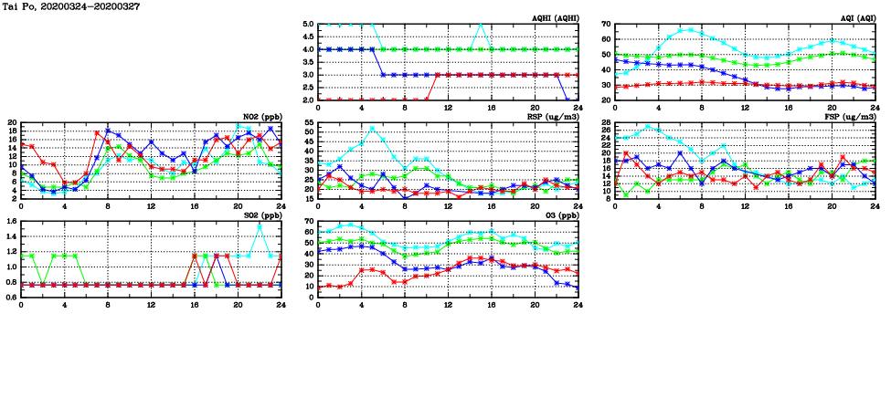| Air Quality Data Time Series in Tai Po (2020/03/27) | ( Line colors: Day -3 Day -2 Day -1 Current day ) | 2D Map Current AQHI |