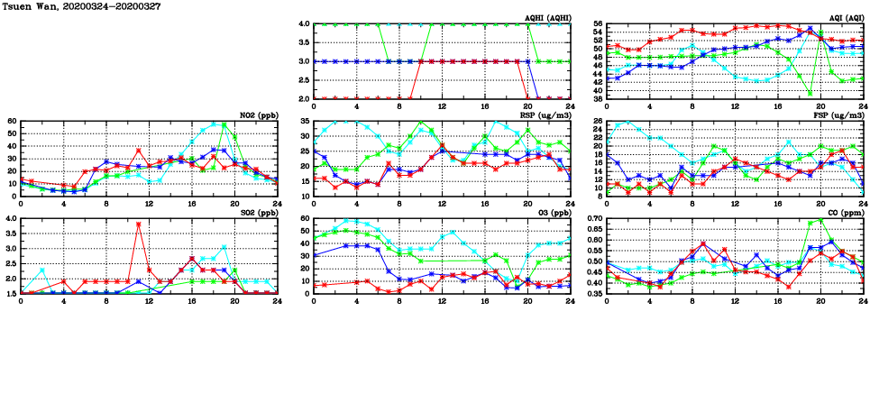 | Air Quality Data Time Series in Tsuen Wan (2020/03/27) | ( Line colors: Day -3 Day -2 Day -1 Current day ) | 2D Map Current AQHI |