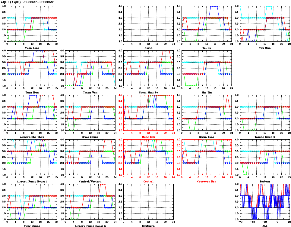 | Air Quality Data Time Series for AQHI (2020/05/18) | ( Line colors: Day -3 Day -2 Day -1 Current day ) | 2D Map Current AQHI |