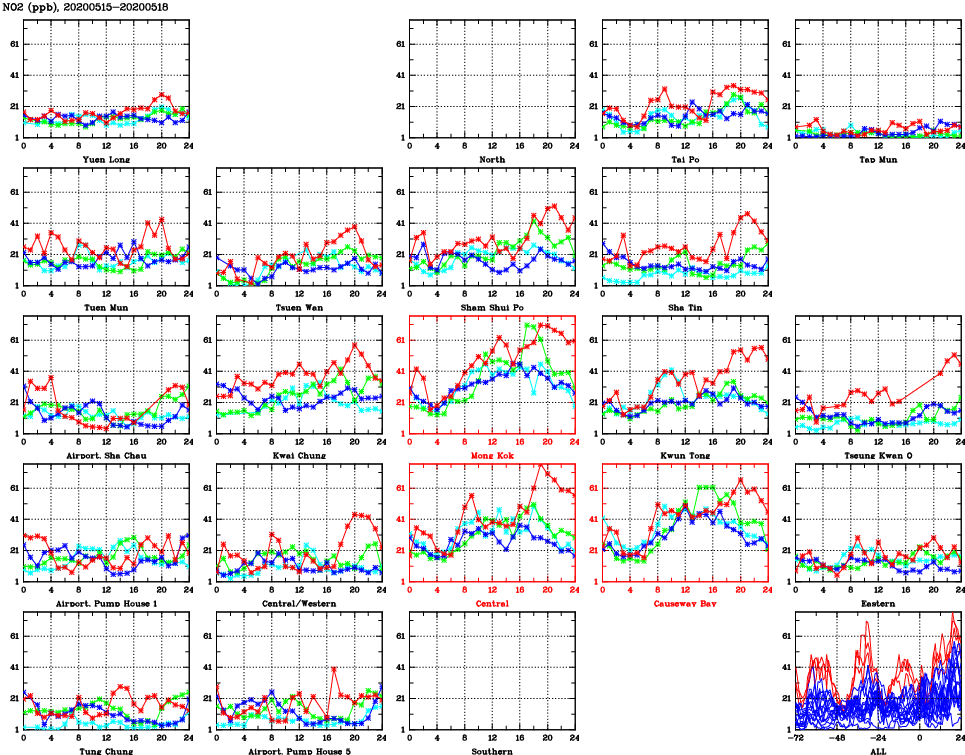 | Air Quality Data Time Series for NO2 (2020/05/18) | ( Line colors: Day -3 Day -2 Day -1 Current day ) | 2D Map Current AQHI |