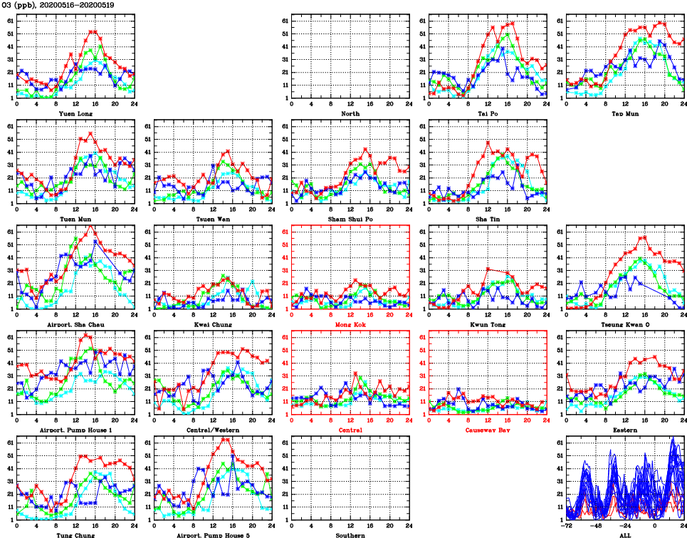 | Air Quality Data Time Series for O3 (2020/05/19) | ( Line colors: Day -3 Day -2 Day -1 Current day ) | 2D Map Current AQHI |