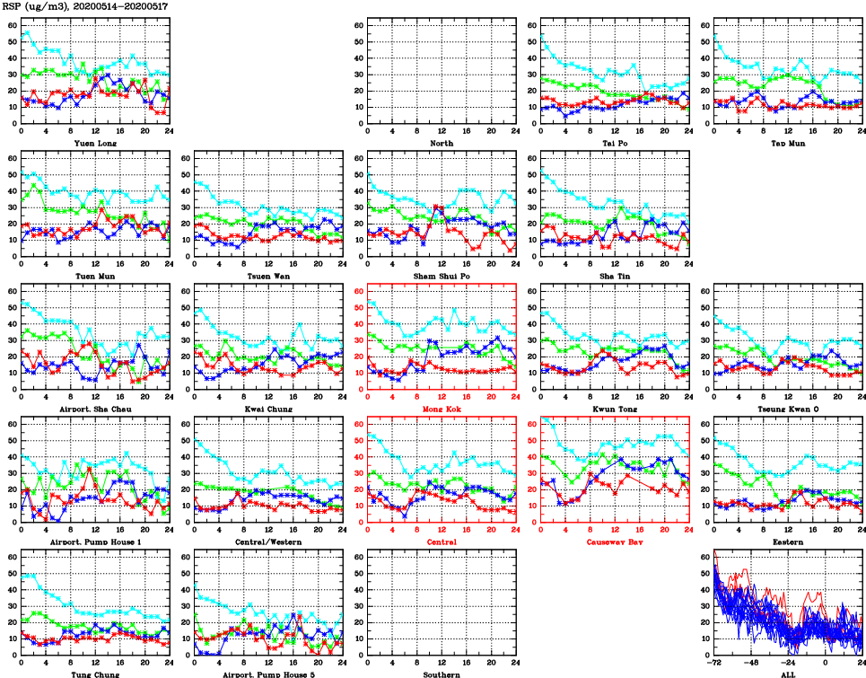 | Air Quality Data Time Series for RSP (2020/05/17) | ( Line colors: Day -3 Day -2 Day -1 Current day ) | 2D Map Current AQHI |