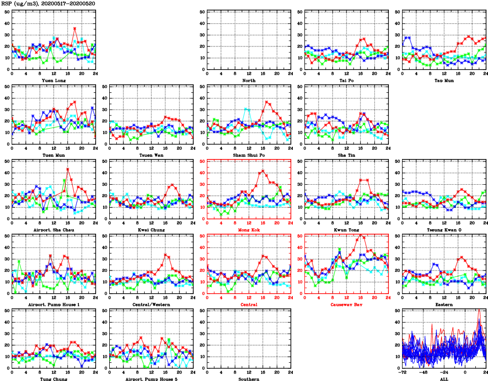 | Air Quality Data Time Series for RSP (2020/05/20) | ( Line colors: Day -3 Day -2 Day -1 Current day ) | 2D Map Current AQHI |