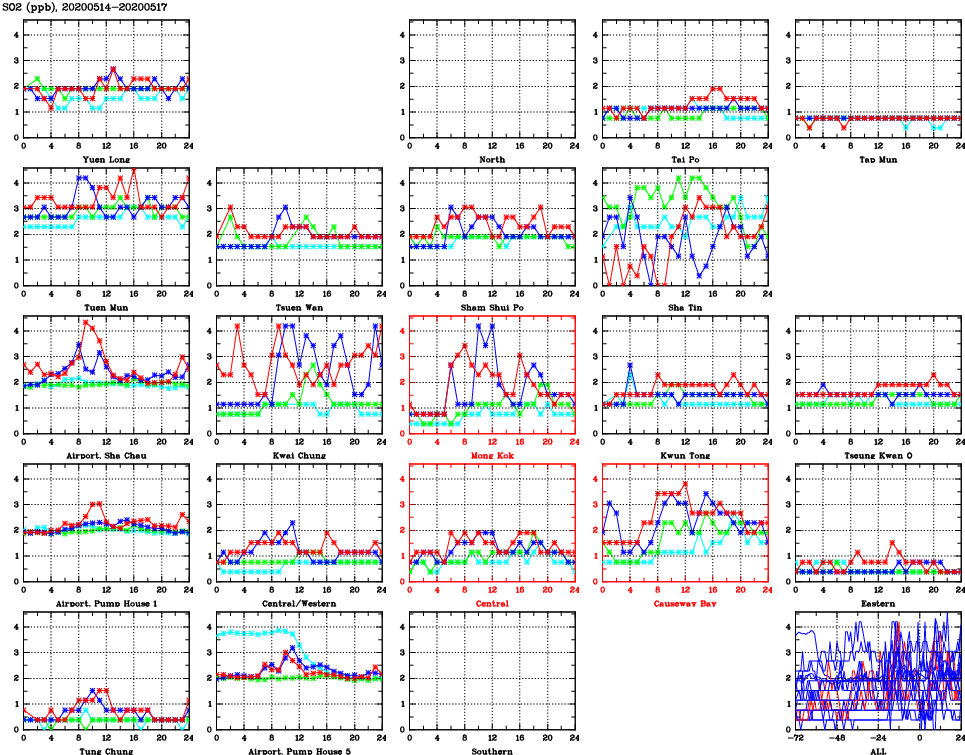 | Air Quality Data Time Series for SO2 (2020/05/17) | ( Line colors: Day -3 Day -2 Day -1 Current day ) | 2D Map Current AQHI |