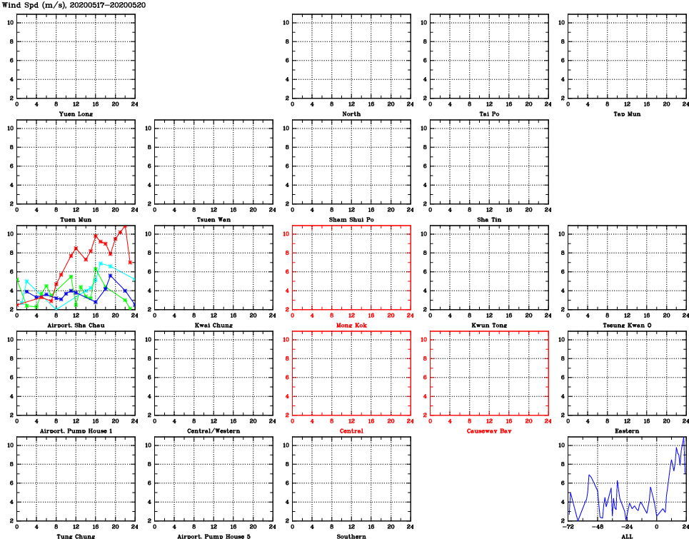 | Air Quality Data Time Series for WS (2020/05/20) | ( Line colors: Day -3 Day -2 Day -1 Current day ) | 2D Map Current AQHI |