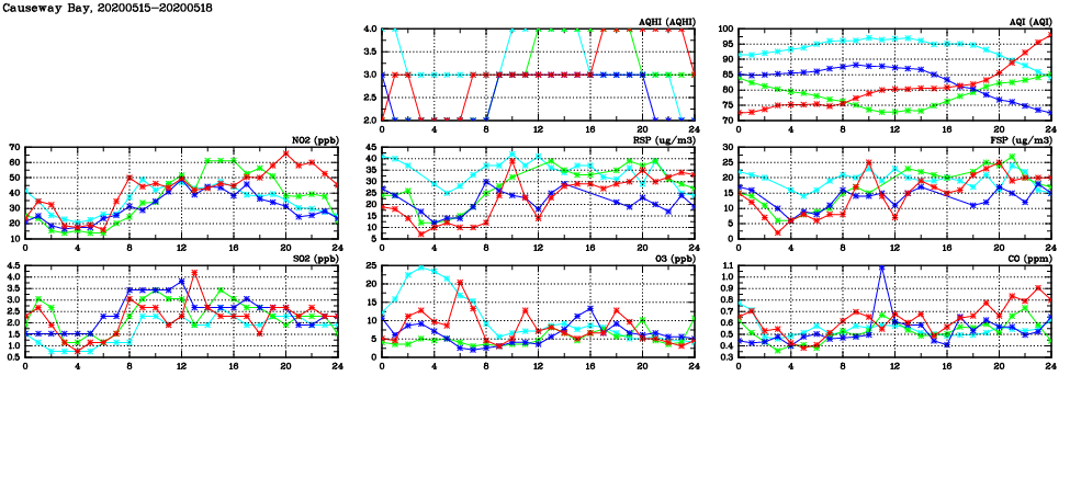 | Air Quality Data Time Series in Causeway Bay (2020/05/18) | ( Line colors: Day -3 Day -2 Day -1 Current day ) | 2D Map Current AQHI |