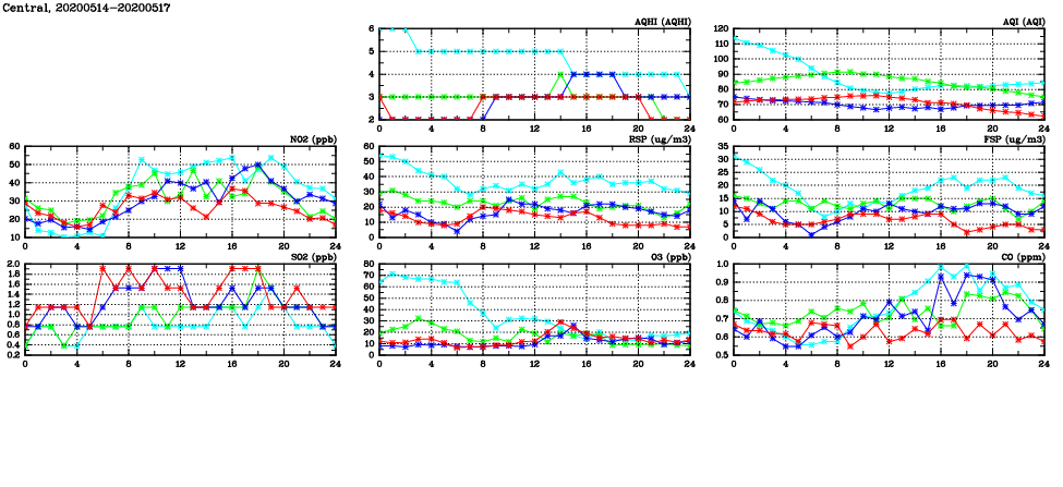 | Air Quality Data Time Series in Central (2020/05/17) | ( Line colors: Day -3 Day -2 Day -1 Current day ) | 2D Map Current AQHI |