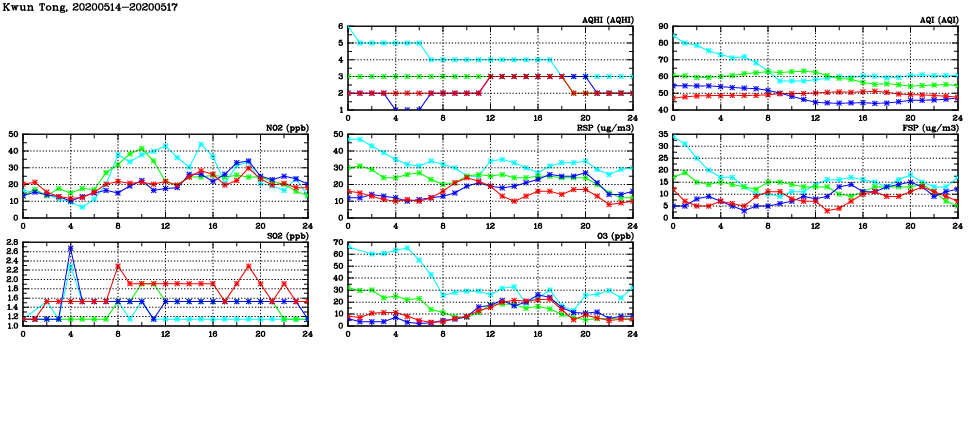| Air Quality Data Time Series in Kwun Tong (2020/05/17) | ( Line colors: Day -3 Day -2 Day -1 Current day ) | 2D Map Current AQHI |