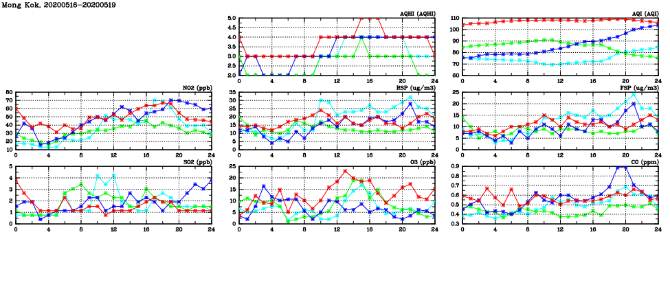 | Air Quality Data Time Series in Mong Kok (2020/05/19) | ( Line colors: Day -3 Day -2 Day -1 Current day ) | 2D Map Current AQHI |