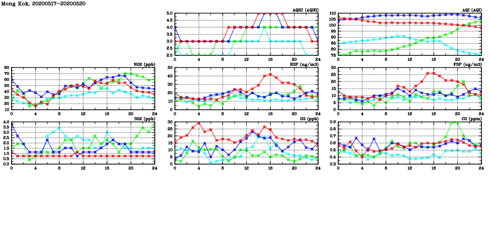 | Air Quality Data Time Series in Mong Kok (2020/05/20) | ( Line colors: Day -3 Day -2 Day -1 Current day ) | 2D Map Current AQHI |