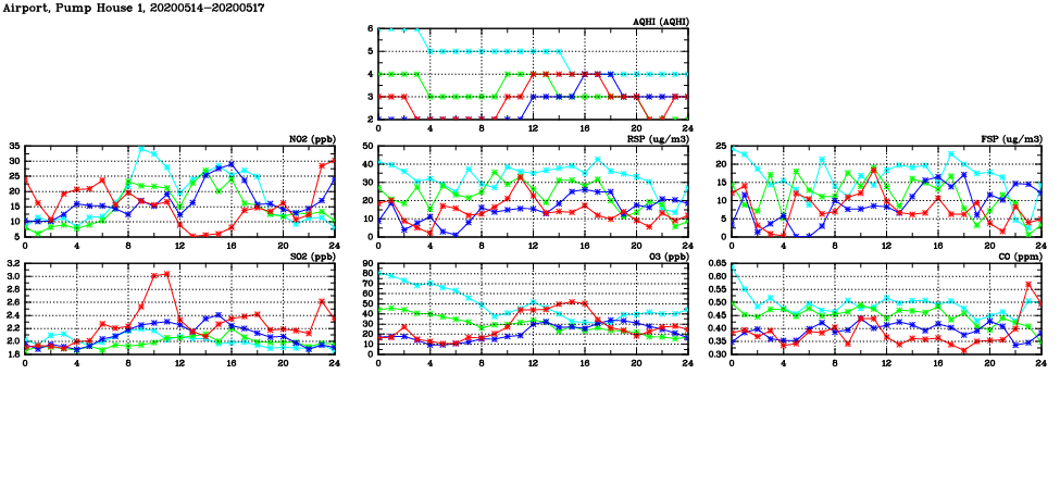 | Air Quality Data Time Series in Airport, Pump House 1 (2020/05/17) | ( Line colors: Day -3 Day -2 Day -1 Current day ) | 2D Map Current AQHI |