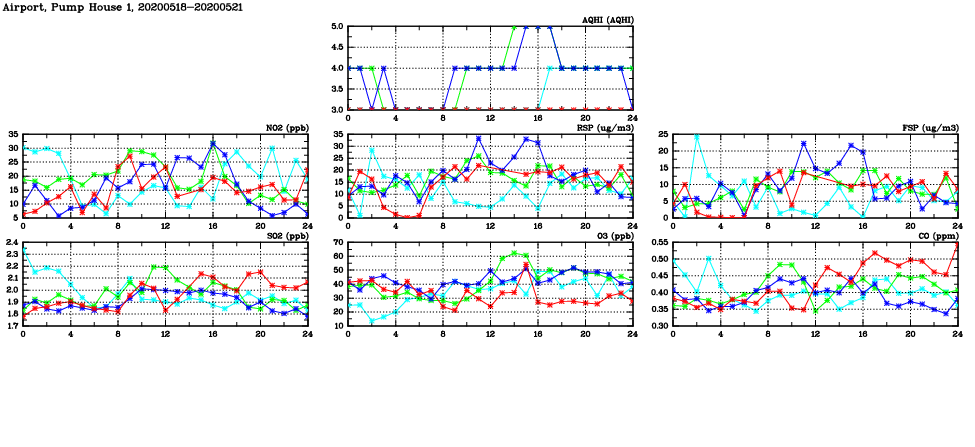 | Air Quality Data Time Series in Airport, Pump House 1 (2020/05/21) | ( Line colors: Day -3 Day -2 Day -1 Current day ) | 2D Map Current AQHI |