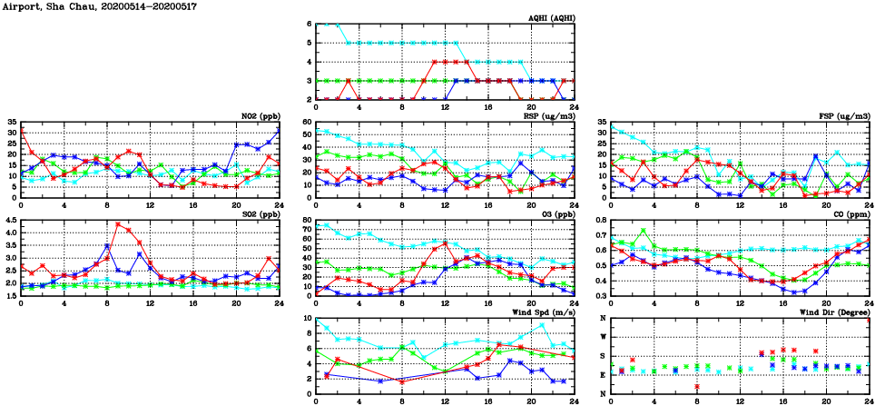 | Air Quality Data Time Series in Airport, Sha Chau (2020/05/17) | ( Line colors: Day -3 Day -2 Day -1 Current day ) | 2D Map Current AQHI |