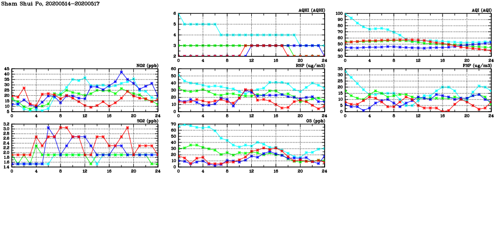 | Air Quality Data Time Series in Sham Shui Po (2020/05/17) | ( Line colors: Day -3 Day -2 Day -1 Current day ) | 2D Map Current AQHI |