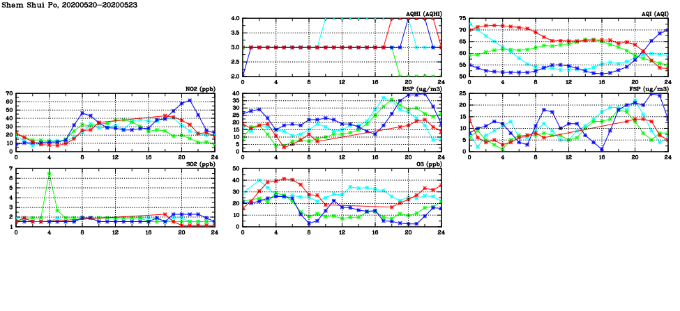 | Air Quality Data Time Series in Sham Shui Po (2020/05/23) | ( Line colors: Day -3 Day -2 Day -1 Current day ) | 2D Map Current AQHI |