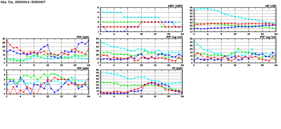 | Air Quality Data Time Series in Sha Tin (2020/05/17) | ( Line colors: Day -3 Day -2 Day -1 Current day ) | 2D Map Current AQHI |