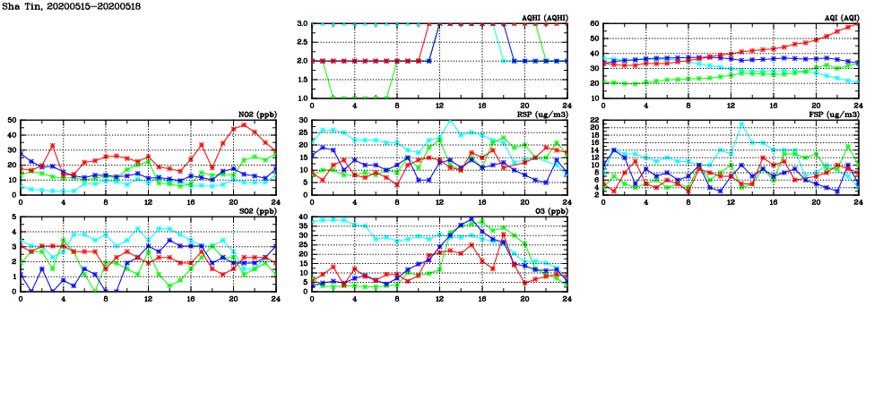 | Air Quality Data Time Series in Sha Tin (2020/05/18) | ( Line colors: Day -3 Day -2 Day -1 Current day ) | 2D Map Current AQHI |