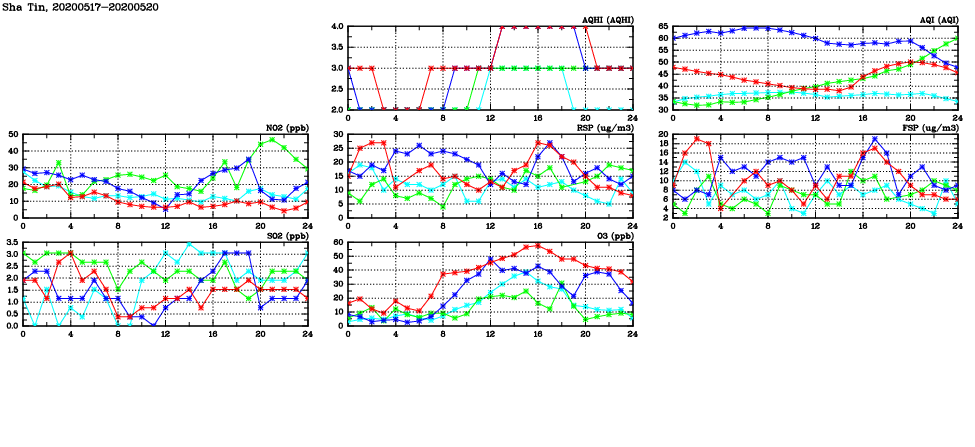 | Air Quality Data Time Series in Sha Tin (2020/05/20) | ( Line colors: Day -3 Day -2 Day -1 Current day ) | 2D Map Current AQHI |
