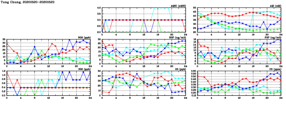 | Air Quality Data Time Series in Tung Chung (2020/05/23) | ( Line colors: Day -3 Day -2 Day -1 Current day ) | 2D Map Current AQHI |