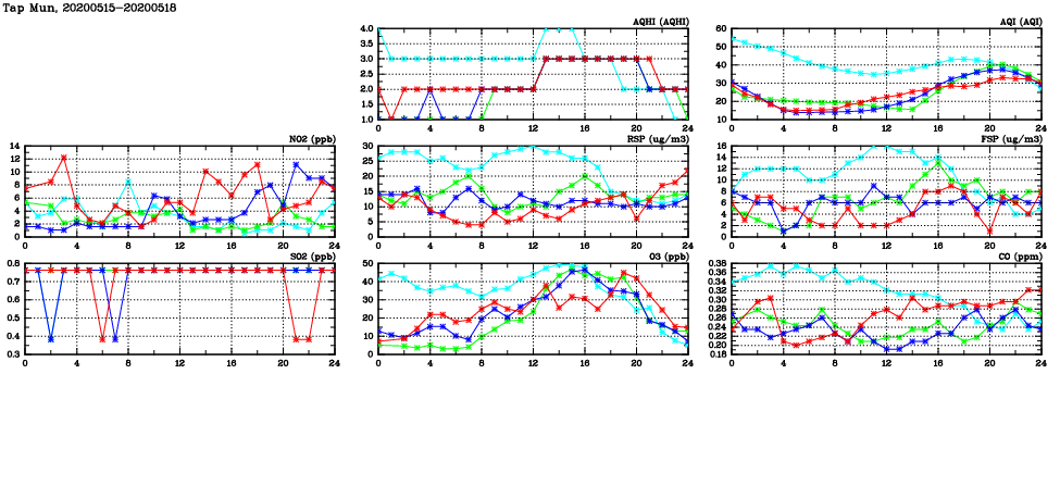 | Air Quality Data Time Series in Tap Mun (2020/05/18) | ( Line colors: Day -3 Day -2 Day -1 Current day ) | 2D Map Current AQHI |