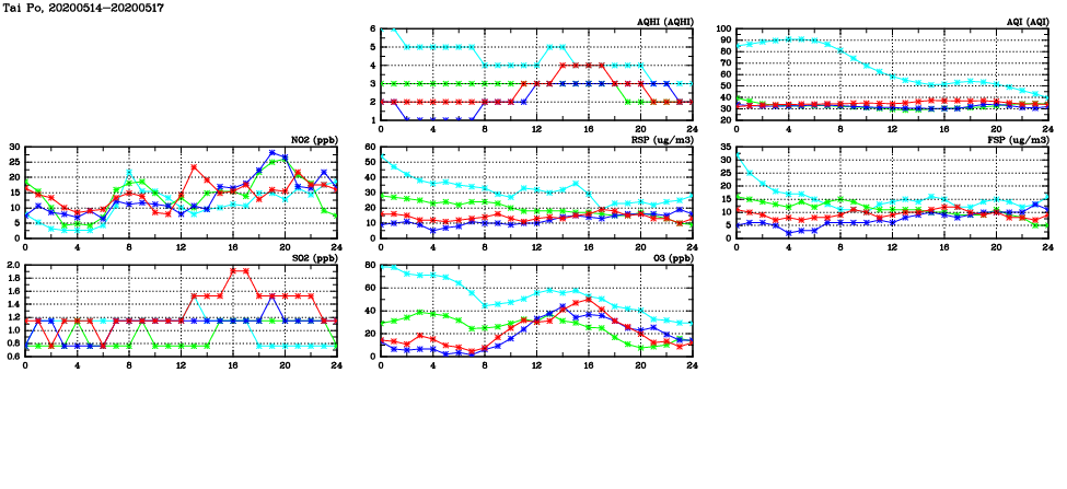 | Air Quality Data Time Series in Tai Po (2020/05/17) | ( Line colors: Day -3 Day -2 Day -1 Current day ) | 2D Map Current AQHI |