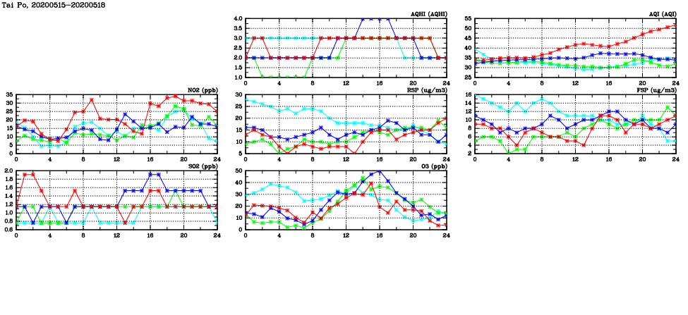 | Air Quality Data Time Series in Tai Po (2020/05/18) | ( Line colors: Day -3 Day -2 Day -1 Current day ) | 2D Map Current AQHI |