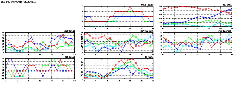 | Air Quality Data Time Series in Tai Po (2020/05/19) | ( Line colors: Day -3 Day -2 Day -1 Current day ) | 2D Map Current AQHI |