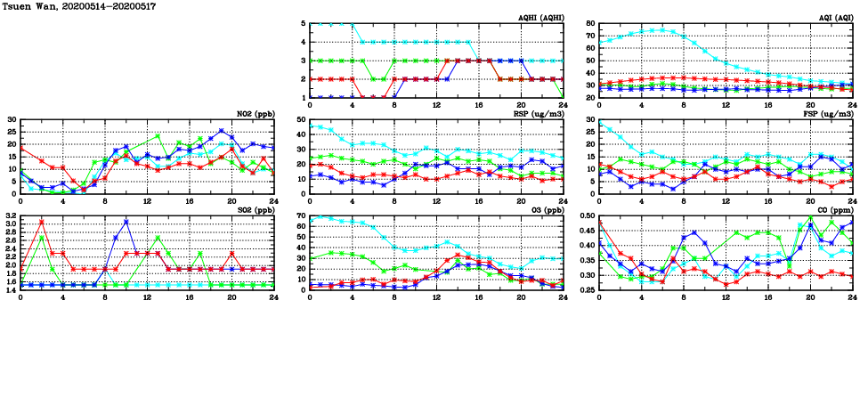 | Air Quality Data Time Series in Tsuen Wan (2020/05/17) | ( Line colors: Day -3 Day -2 Day -1 Current day ) | 2D Map Current AQHI |