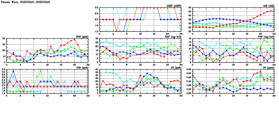 | Air Quality Data Time Series in Tsuen Wan (2020/05/18) | ( Line colors: Day -3 Day -2 Day -1 Current day ) | 2D Map Current AQHI |